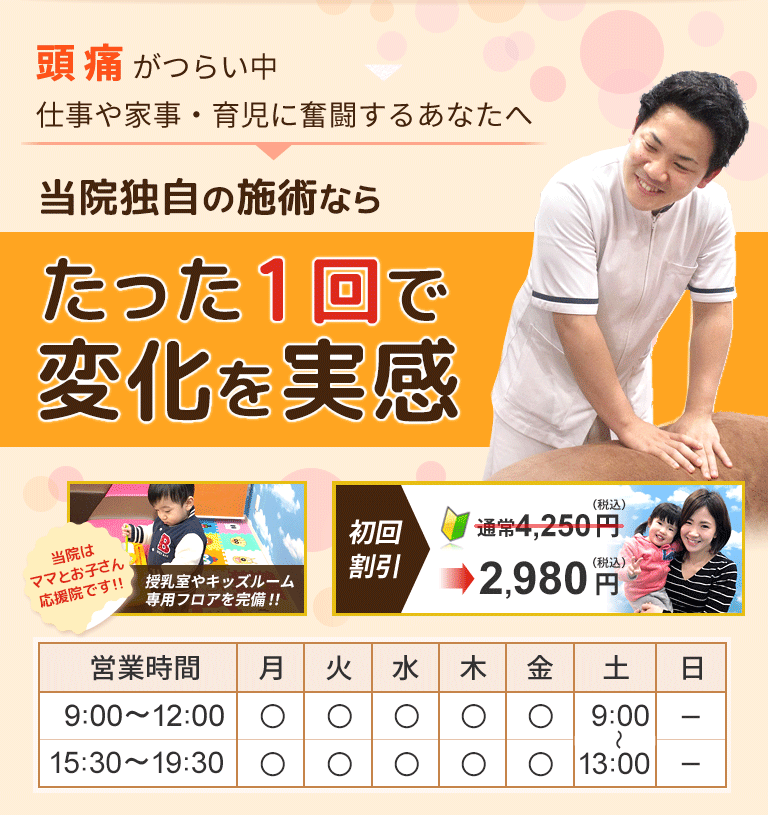 - 丁寧なカウンセリングで、痛む場所・出るタイミング(天候、仕事後、睡眠不足など)や、首こり・吐き気の有無を整理